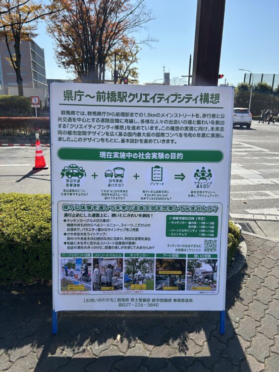 『群馬県では、群馬県庁から前橋駅までの1.5kmのメインストリートを、歩行者と公共交通を中心とする道路空間に再編し、多様な人々の出会いの場と賑わいを創出する「クリエイティブシティ構想」を進めています。