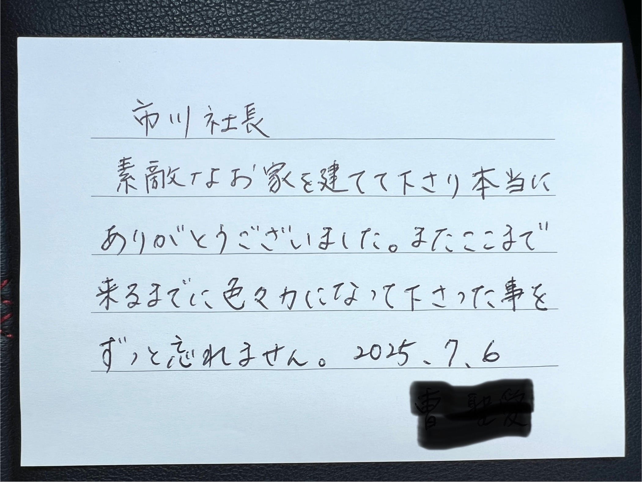 CEO Blog 代表ブログ HOME代表ブログお手紙頂きました。 2025.08.30 お手紙頂きました。 先月お引き渡しさせて頂いたS様より、お引き渡しの際にお手紙を頂きました。 ヤマイチのOB様宅を気に入って頂き、一目惚れ状態でご契約頂いたお客様です。 家づくりだけではなく、色々な事が右葉曲折ありました。 最後、お引き渡しの時にこのお手紙を頂いて、我ながら良い仕事したなと自負しております(笑)! スタッフブログはこちら New 最近の投稿 1年点検でのお伺い 炭ラーメン 本社の外階段 メンテナンス ウッドマイザー Archive アーカイブ 2025年11月[2] 2025年10月[2] 2025年9月[1] 2025年8月[2] 2025年3月[2] 2025年2月[4] 2024年1月[1] 2023年11月[1] 2023年7月[1] 2023年1月[1] 2022年11月[1] 2022年8月[1] 2022年7月[2] 2022年5月[2] 2022年4月[1] 2022年3月[3] 2022年2月[1] 2022年1月[2] 2021年12月[1] 2021年11月[4] 2021年10月[4] 2021年9月[3] 2021年8月[2] 2021年7月[2] 2021年6月[1] 2021年5月[2] 2021年4月[5] 2021年3月[2] 2021年2月[13] View more