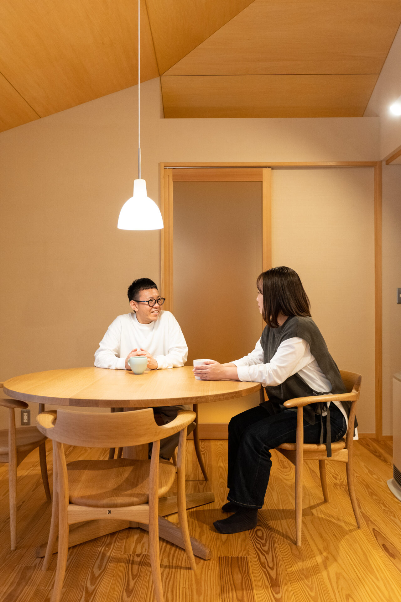 Sさんの家は回遊動線やたっぷりとした収納を確保しながら、寛げる場所と籠もれる場所も実現しています。最初は広くて大きな家がいいと思っていたというSさんですが「小さな家でも居心地のいい場所をつくってあげれば、いつもそこにいるから無駄に広い家をつくる必要はないよ」と市川さんに言われたそうです。「たしかにお気に入りの場所はダイニングか掘り込まれたリビングですし、家の性能がいいから、家のどこにいても温度が一定でストレスがないのが最高です。冬場の結露とかも一切ないですしね。」性能と機能、そして意匠をバランスさせるというヤマイチの家づくりがまさに具現化されたSさんの家。この日はデッキの目隠しの柵の打ち合わせも兼ねていましたが、建てたあとのフォローも含め、ずっと心地よさが続く住まいになりそうです。