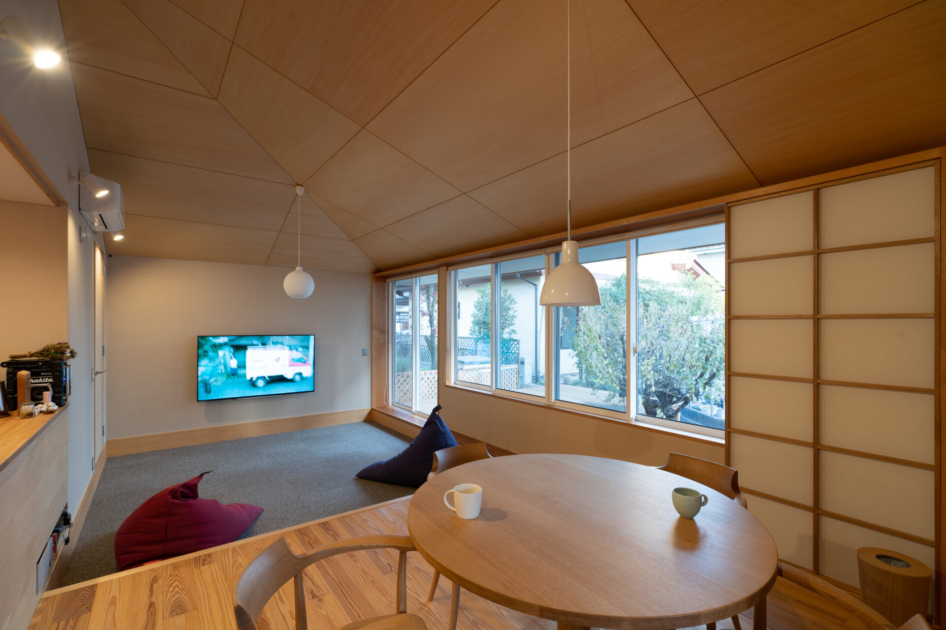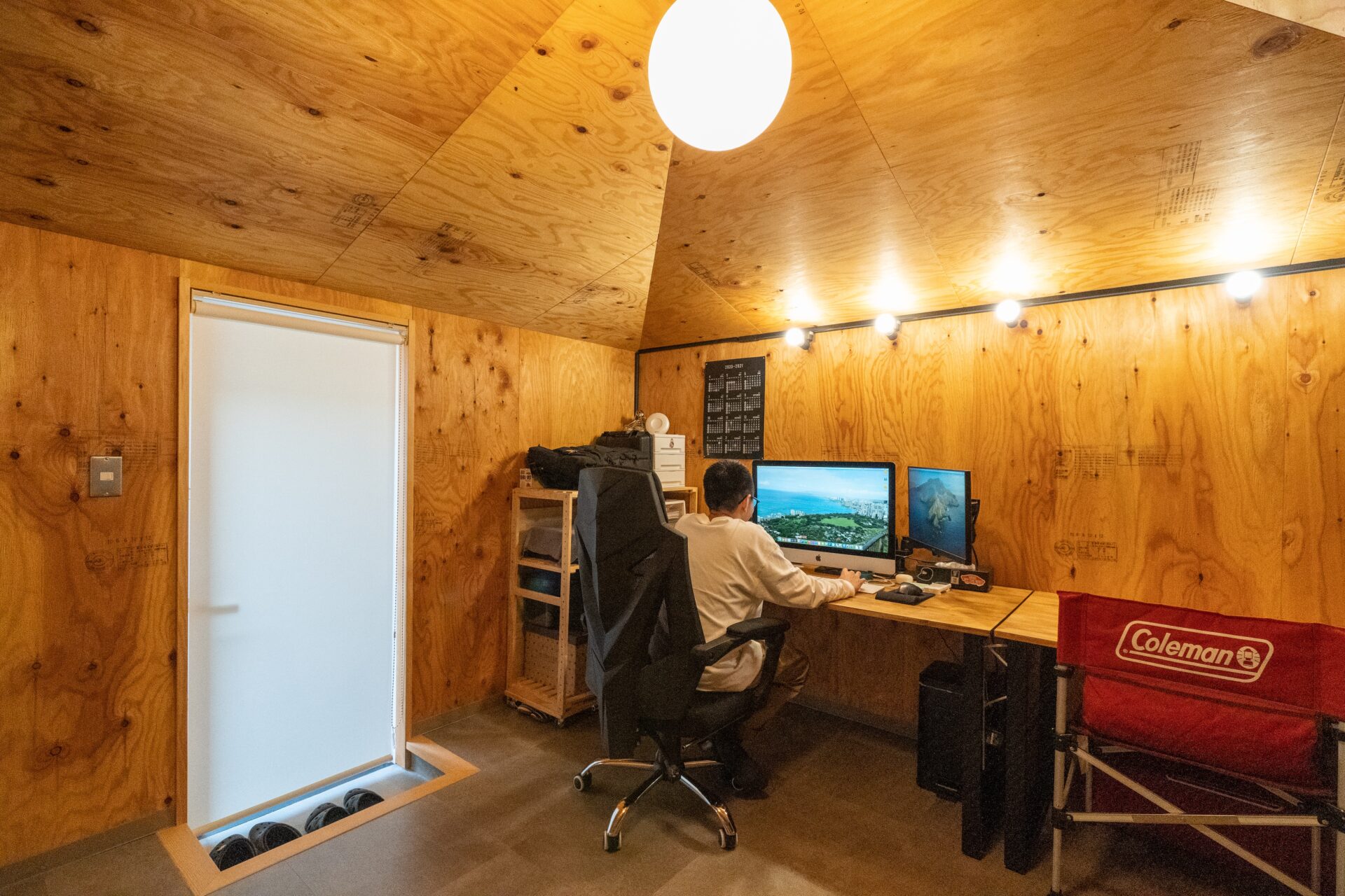 Sさんの家は方形屋根が3連でつながる構成になっています。これは市川さんからの提案だったそう。「これはさすがだなと思いました。スケボーの整備や動画編集する趣味部屋が欲しいとお願いしたんですが、離れとガレージとを別棟にし建物を絶妙にずらすことで、道路からの視線をうまく切ってるんです」もともと平屋を希望されたSさんですが、想像を上回る提案に一発OKを出されたそう。「社長の家づくりへの思いや知識にはいつも感心させられていたので、信頼してお任せしました。ネットでちょっと勉強したくらいの知識で素人があれこれ言ってもいい家にはなりませんから」そう話すSさん、奥様の就職先まで市川さんにお世話になることになったそう。「それだけ市川さんのことを信頼しているということなんです」