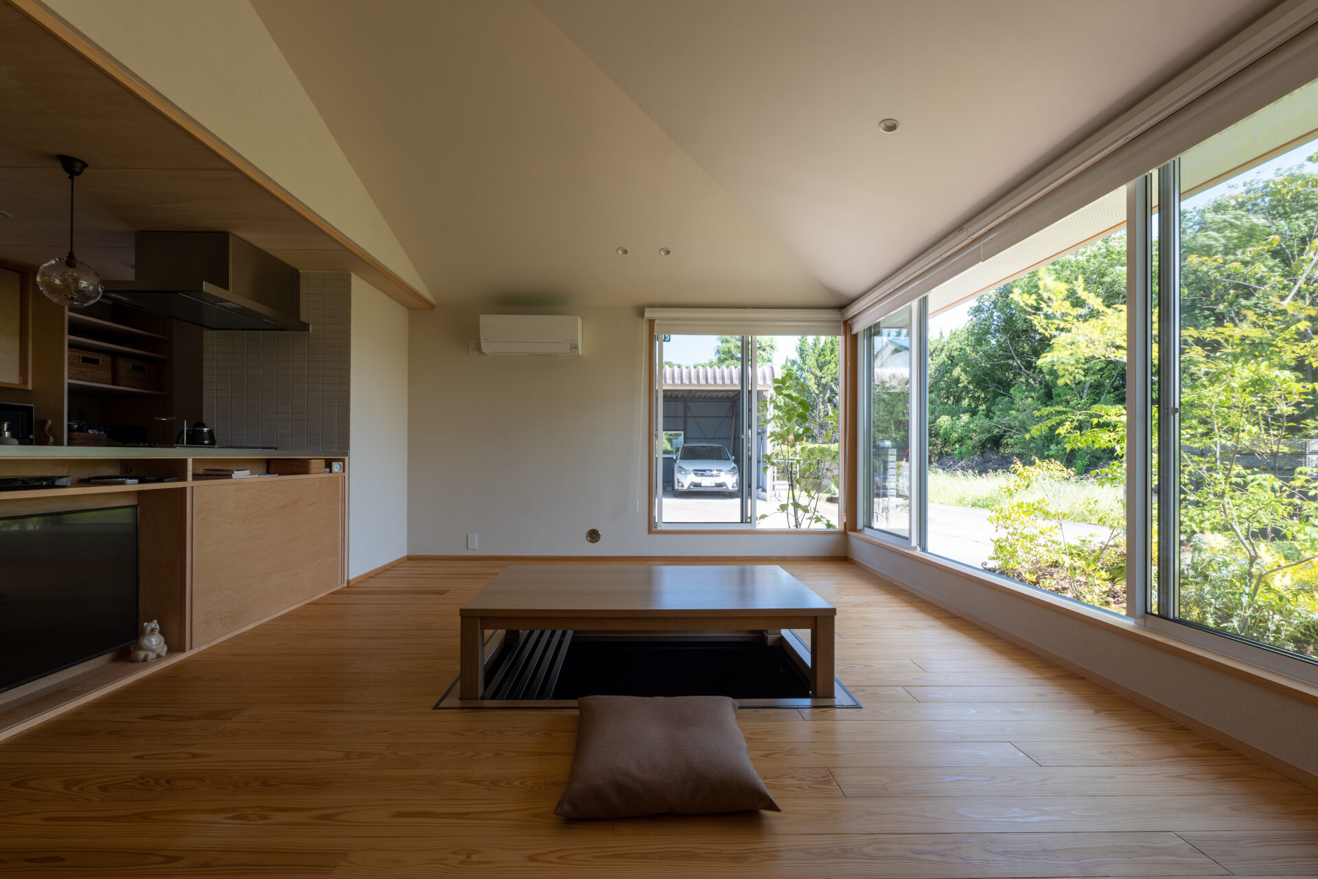 Mさんのお住まいは、重心を下げるというのがコンセプト。天井高は2,100mmに抑えられています。「私、背が高いので、最初は『大丈夫かな?』と心配もあったんですが、出来上がってみたら全く違和感もないし、むしろこれで良かった!」とMさん。その言葉通り、全体的に落ち着きのある雰囲気ながら、リビングダイニングの勾配天井と大きな窓が開放感を演出する、気持ちのいい家になりました。