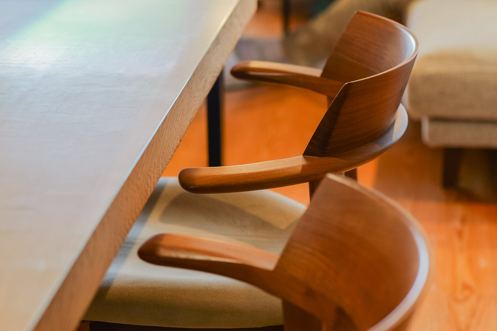 暮らし始めて5年。日々の中で感じているのは、変わらない心地よさだといいます。特にヤマイチのシンボルともいえる杉の浮造り仕上げの床は、夏はさらりと涼しく、冬はほんのりと暖かい。時を重ねるごとに、木はあめ色へと変わり、やわらかな照りと味わいが増してきました。小さな傷やへこみも、愛おしい家族の歴史のように感じられる存在になっています。ダイニングには、一枚板の造作で仕上げたテーブルを。椅子も一緒に選び、ご家族にとってかけがえのない居場所になりました。