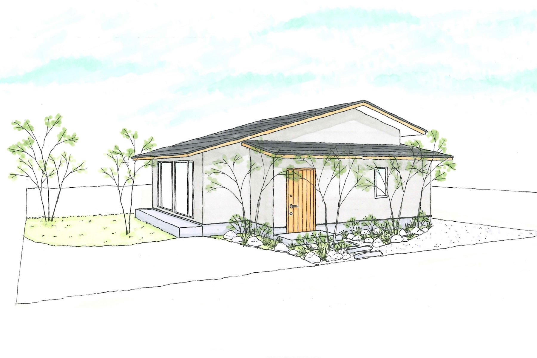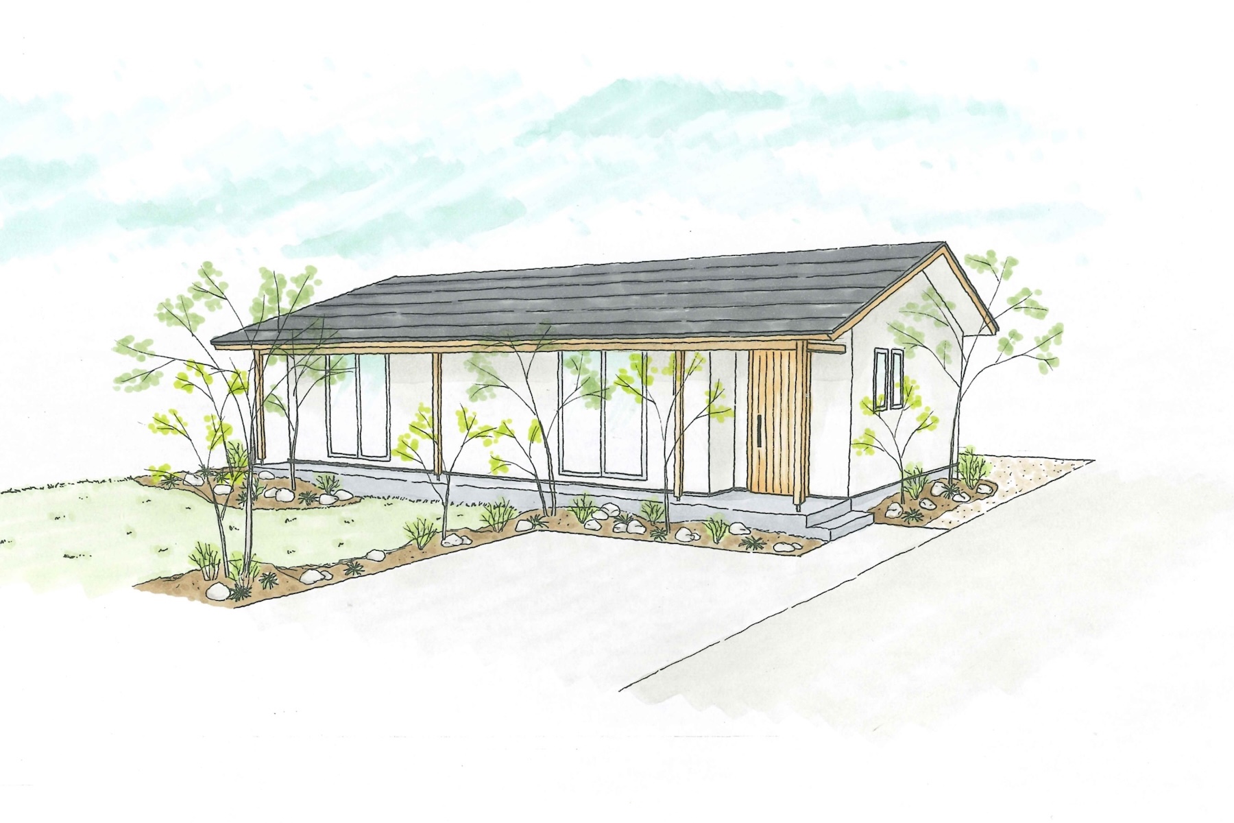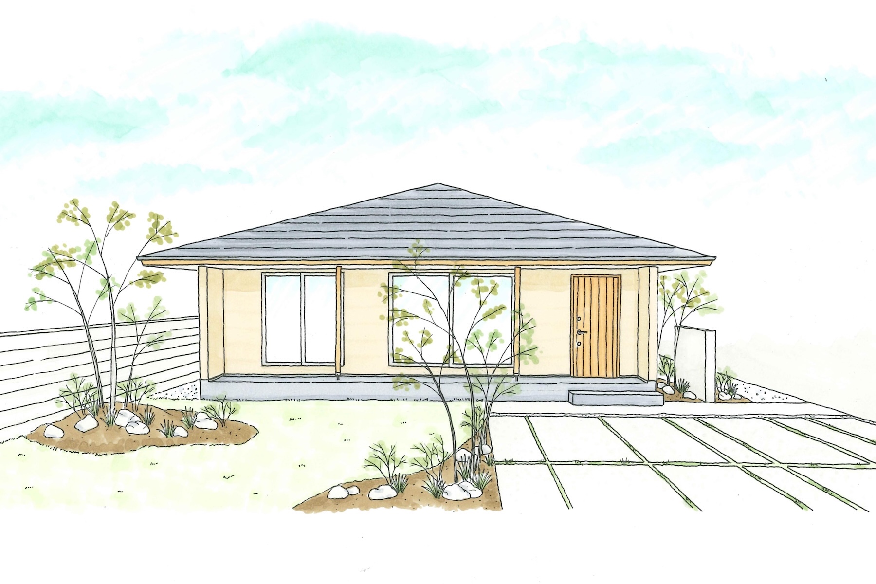 外観は、ナチュラルカラーの塗り壁を基調とすることで、時を経ても美しく、柔らかい印象に。天然木で作るドアが塗り壁と調和し、上質な佇まいを演出しています。
