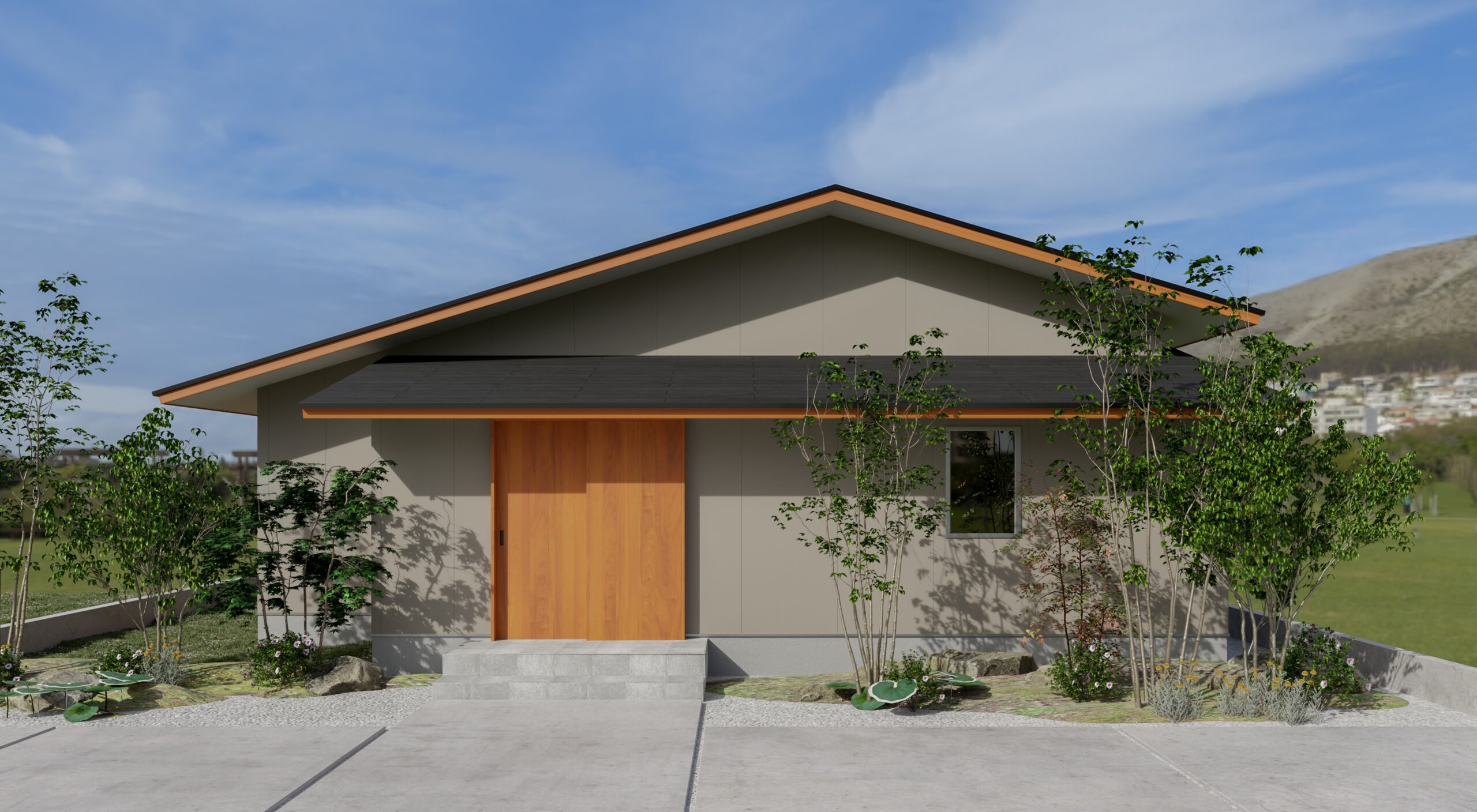 外観は、ナチュラルカラーの塗り壁を基調とすることで、時を経ても美しく、柔らかい印象に。天然木で作るドアが塗り壁と調和し、上質な佇まいを演出しています。