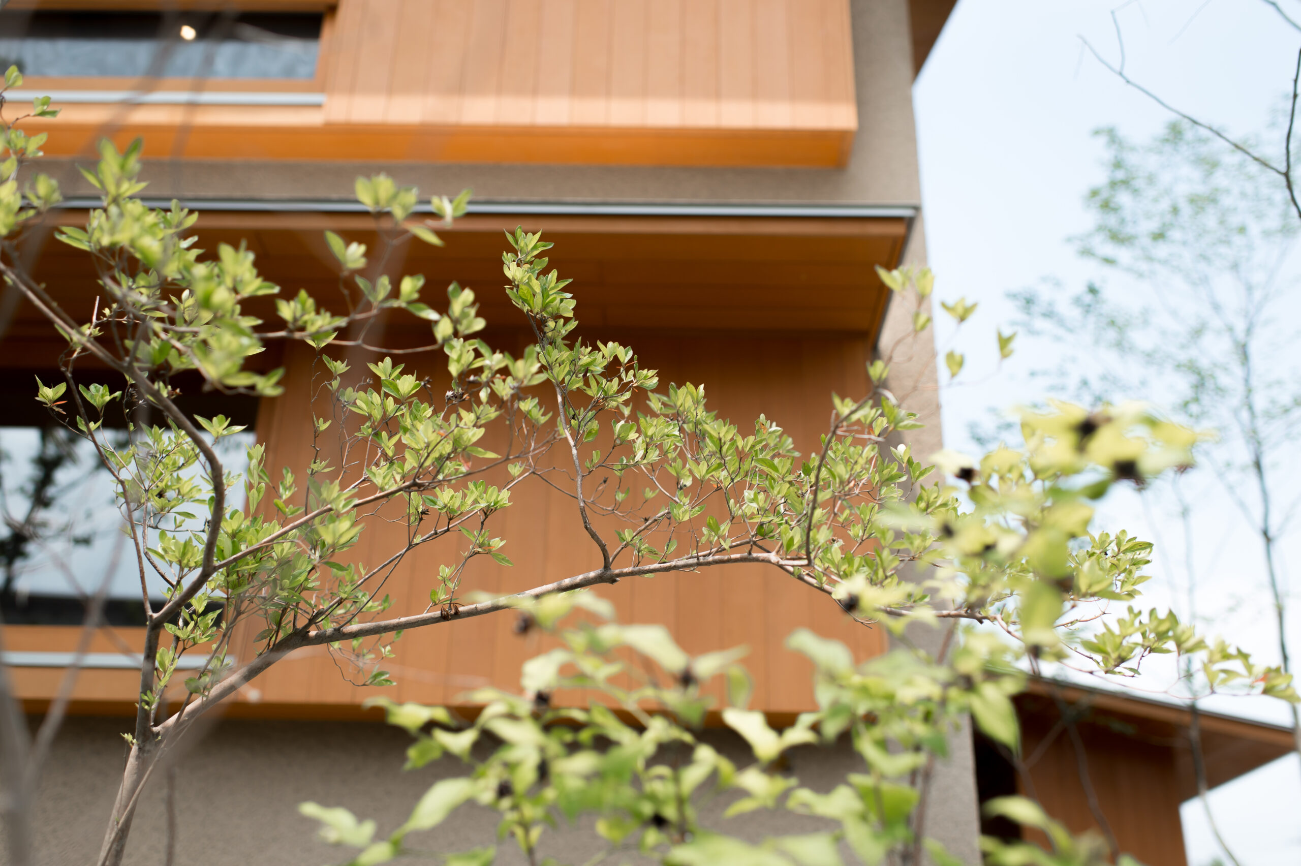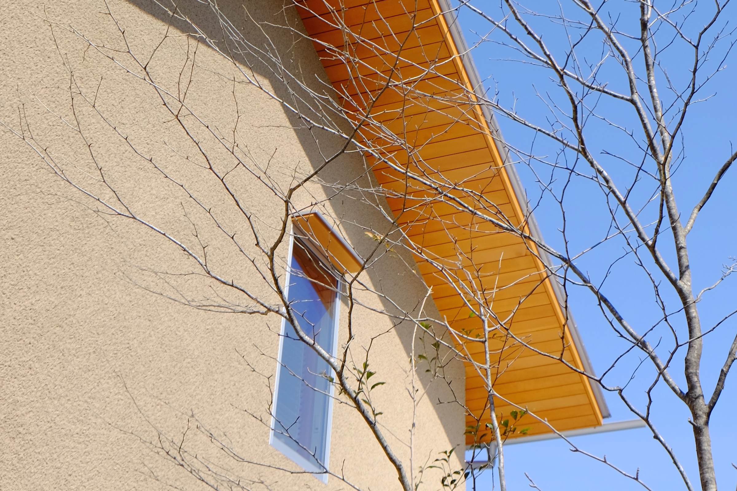 株式会社ヤマイチでは、軒天(軒裏)や外壁の一部の板張り部分に天然木のヒバやヒノキ、サワラを使用しています。外装材は、雨風にさらされるため耐久性が求められます。水に強い素材を採用すると共に、いつまでも美しい見た目を維持し、上質なデザイン・風合いを表現できる素材をご提案しています。塗り壁とのコントラストも美しく、家の佇まいをより上質に仕上げます。
