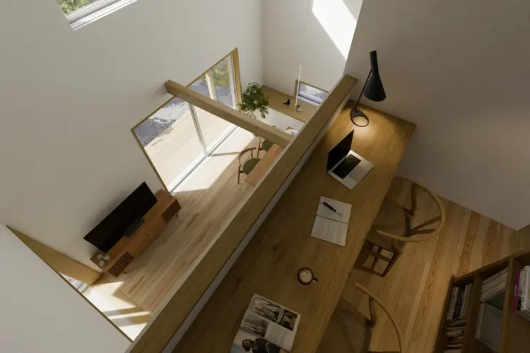白い漆喰の内壁に、床材や見せ梁に明るめの天然木を活用することで、優しく温かい印象に仕上げる工夫をしています。