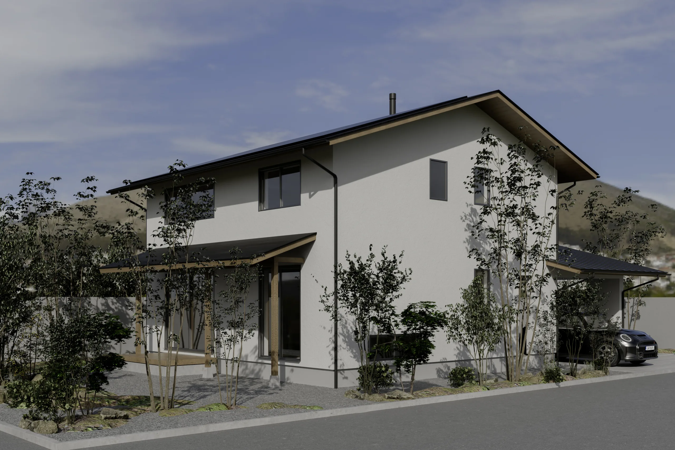 白の塗り壁を基調とした和モダンデザインの外観は、庭の緑が映え周辺の自然と調和する佇まいに。