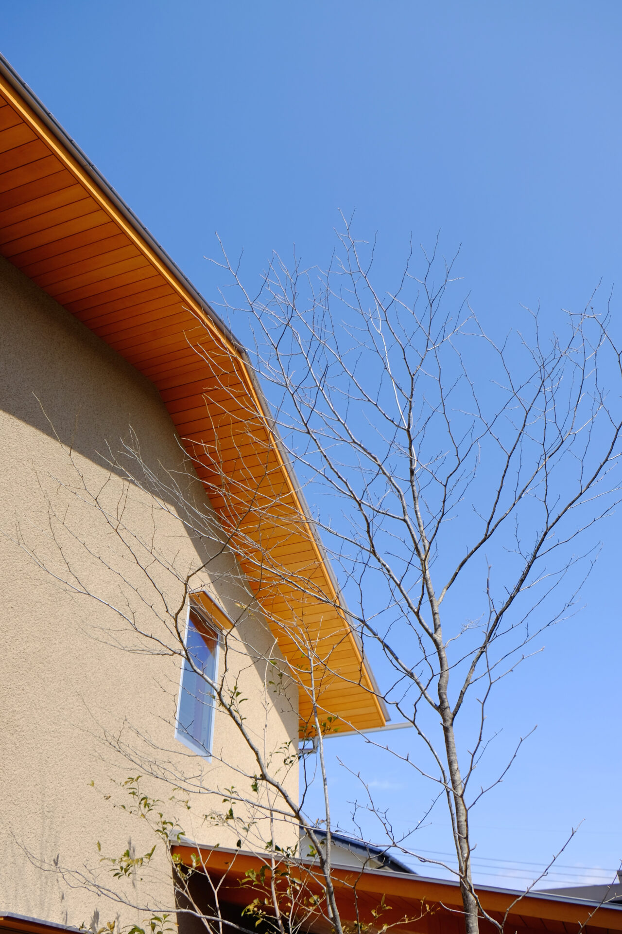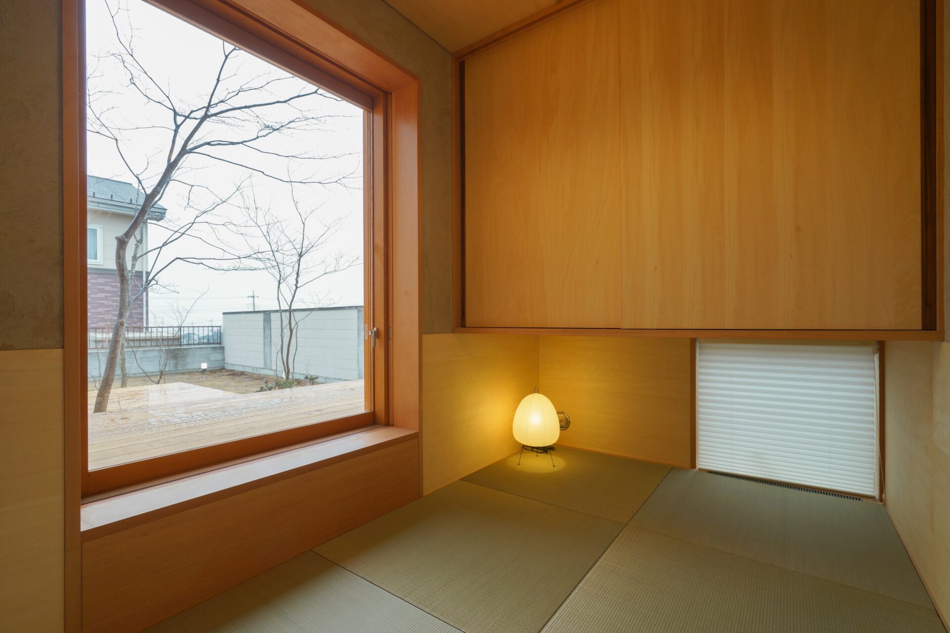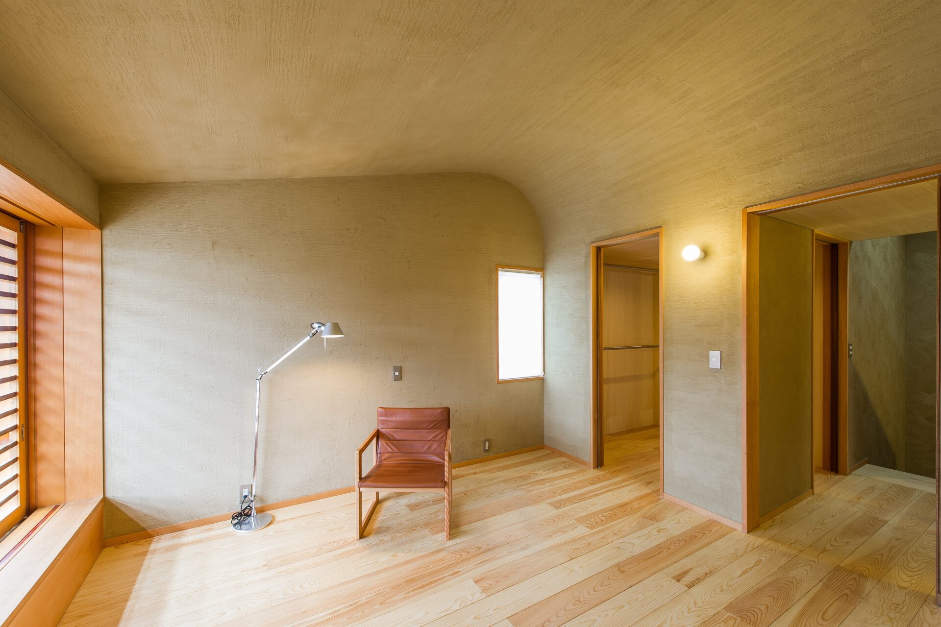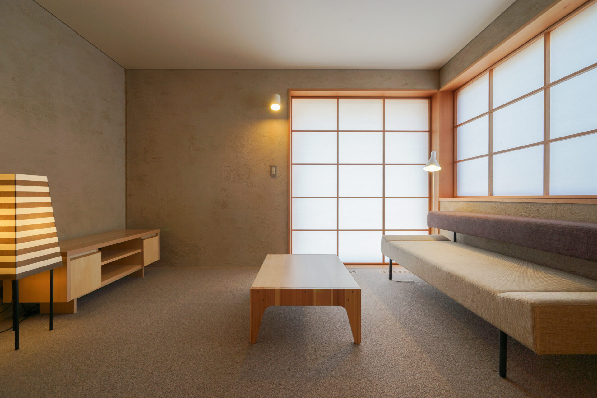 伊礼氏が設計作法として掲げ、ヤマイチも想いを同じくする『ソトからくる心地よさ』に着目した、四季折々の自然を感じて暮らす豊かさのある住まいです。色のトーンを抑えた珪藻土の壁や月桃紙の天井を間接照明が優しく照らす心地よい内装に仕上がりました。