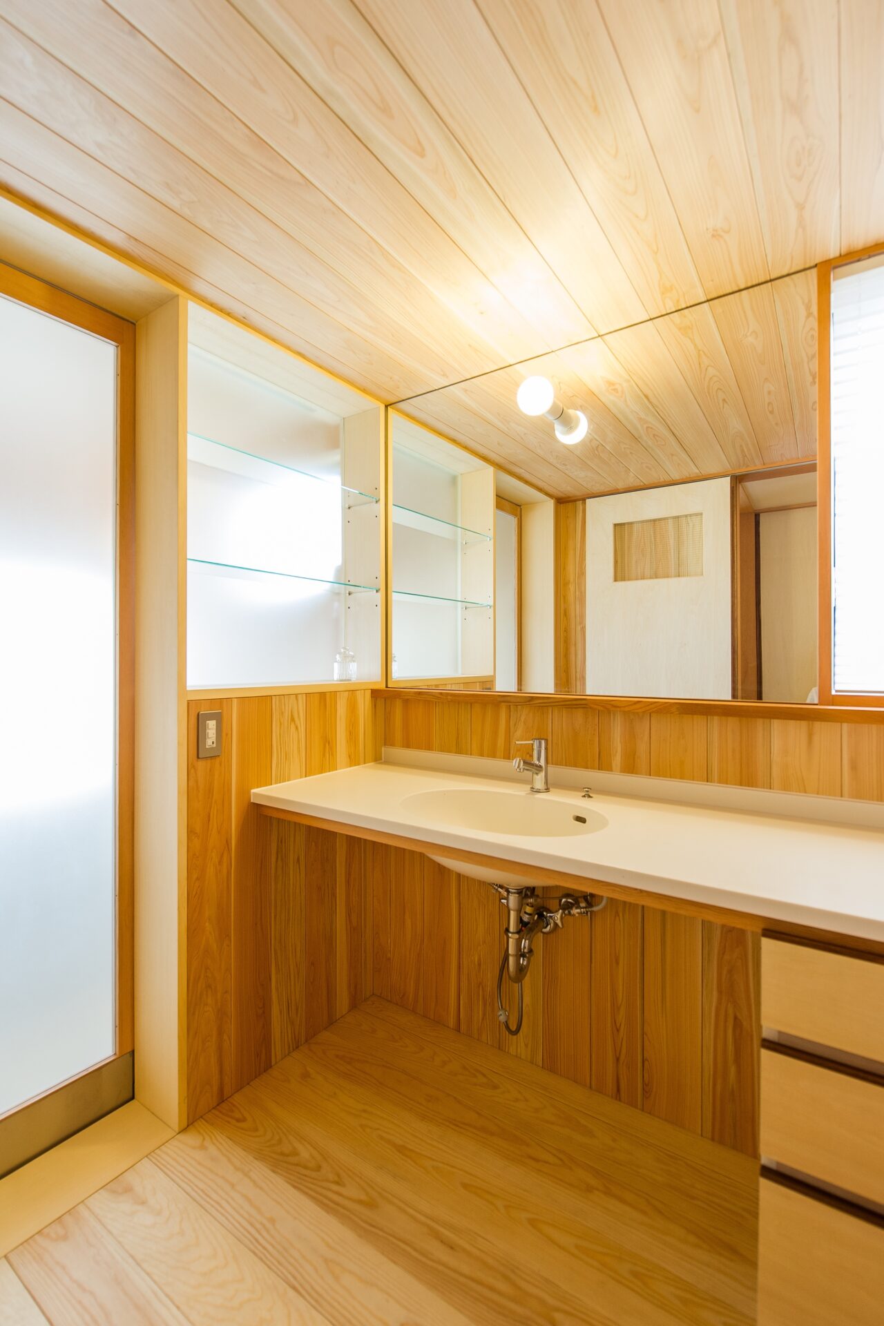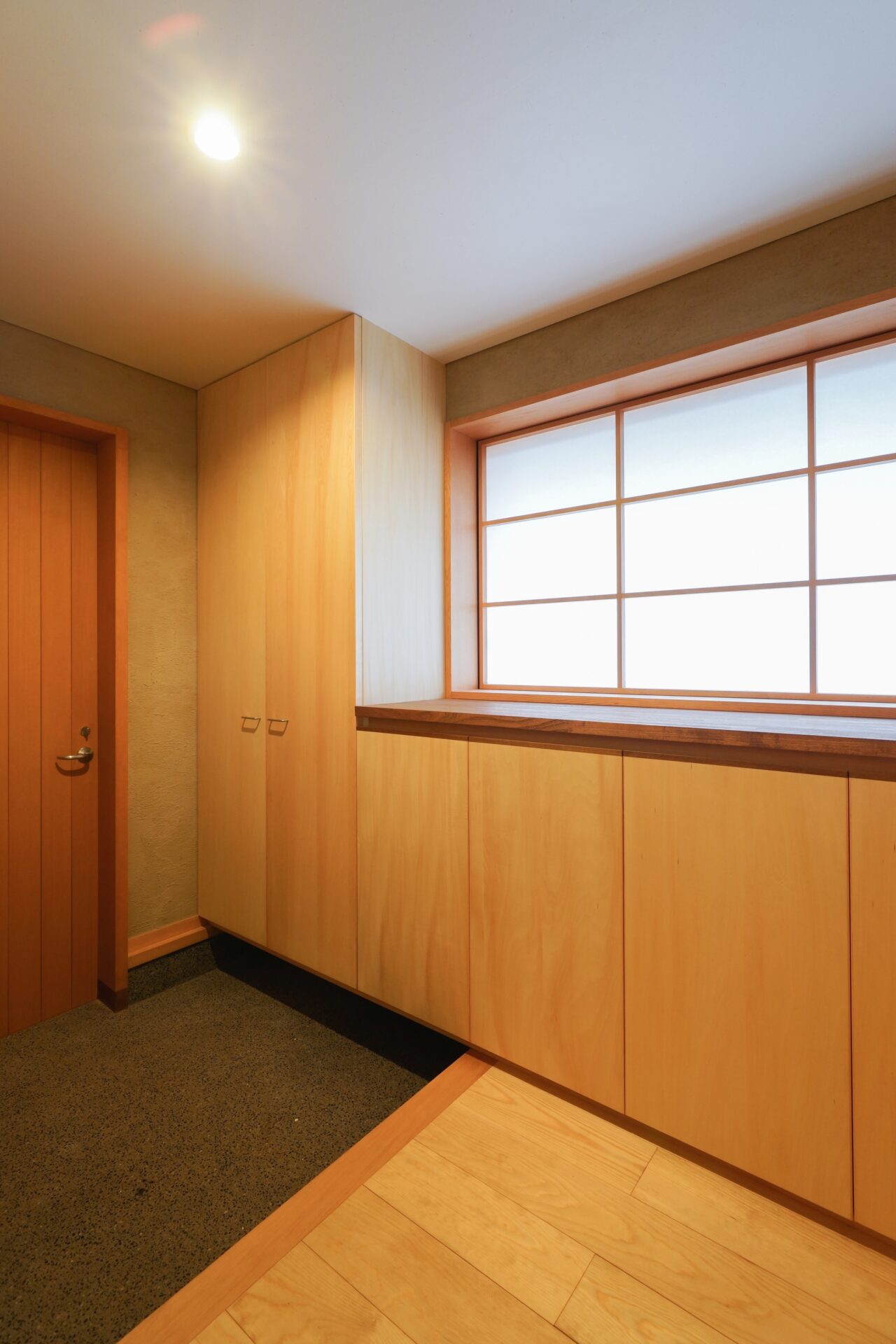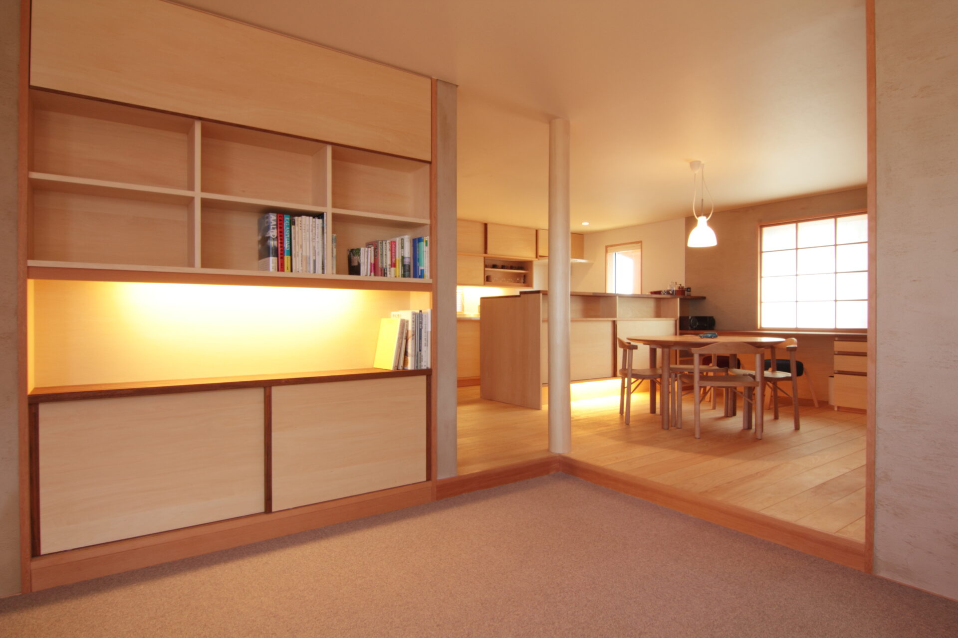 伊礼氏が設計作法として掲げ、ヤマイチも想いを同じくする『ソトからくる心地よさ』に着目した、四季折々の自然を感じて暮らす豊かさのある住まいです。色のトーンを抑えた珪藻土の壁や月桃紙の天井を間接照明が優しく照らす心地よい内装に仕上がりました。