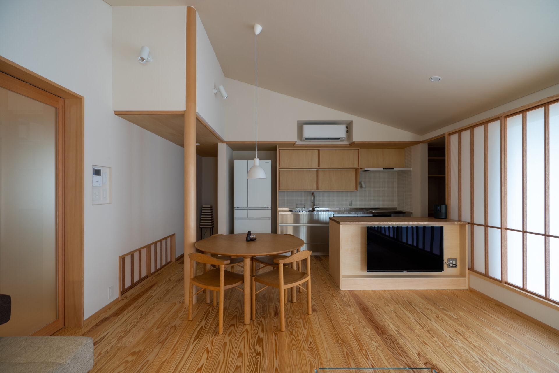 リビングには二面に大きく窓を取ることに加え、木部分の細さにもこだわった障子を使用するなど、随所にこだわりの素材を活用した上質な住まいです。