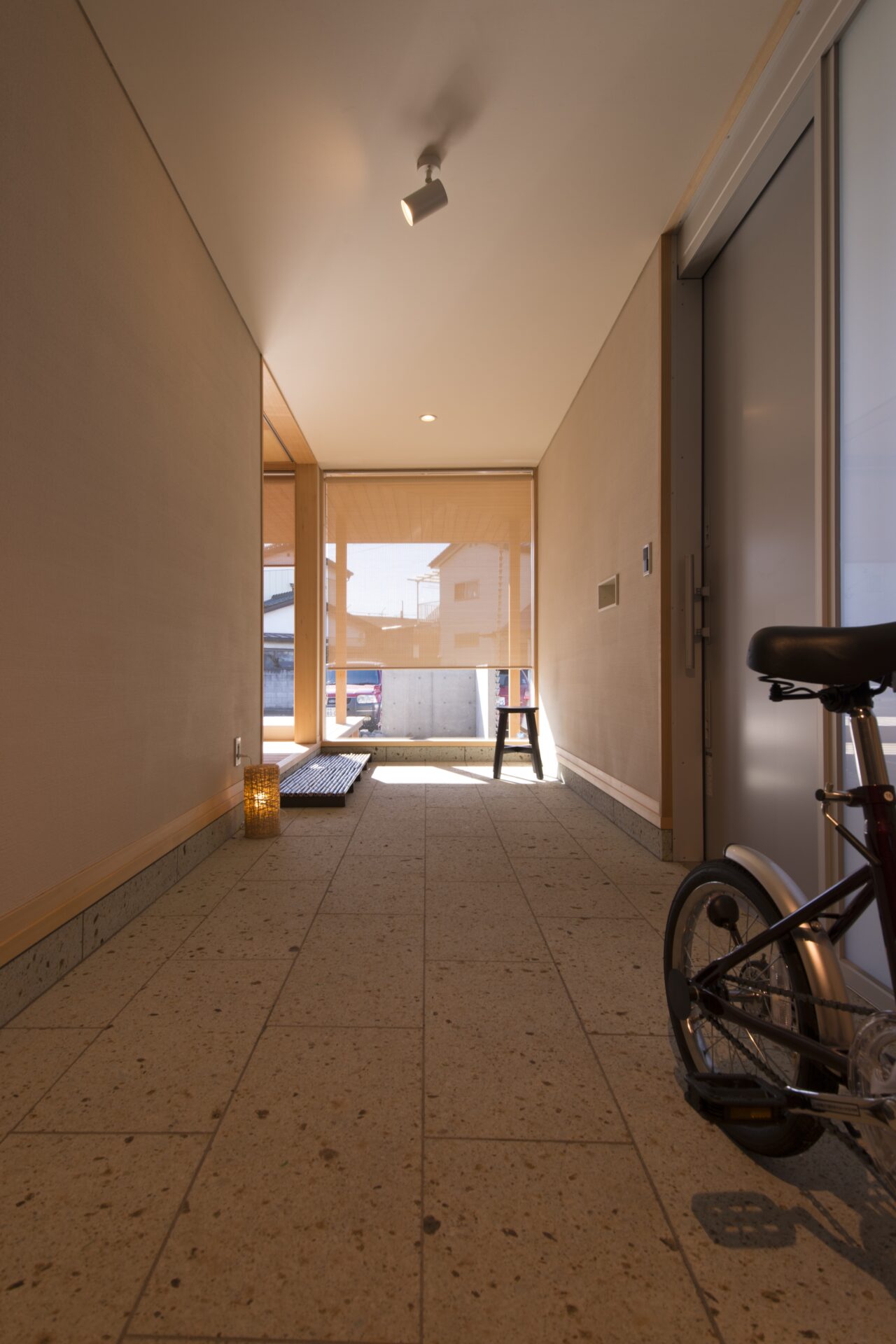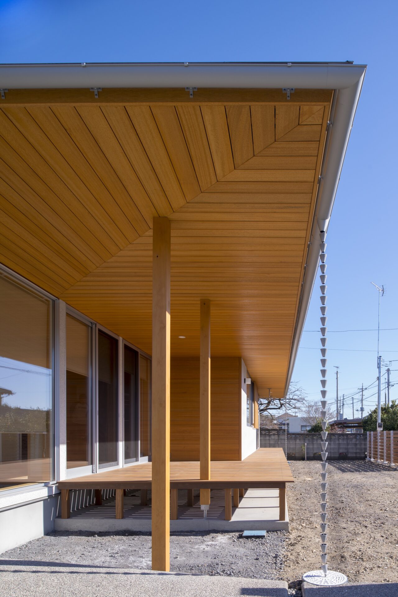 緩やかなスロープの先にある大きな引き戸を解放すると、伸びやかな玄関土間が現れ、開放的なLDKに繋がる。住まい手の将来を考えた、木の優しい香りが漂うバリアフリーの家。
