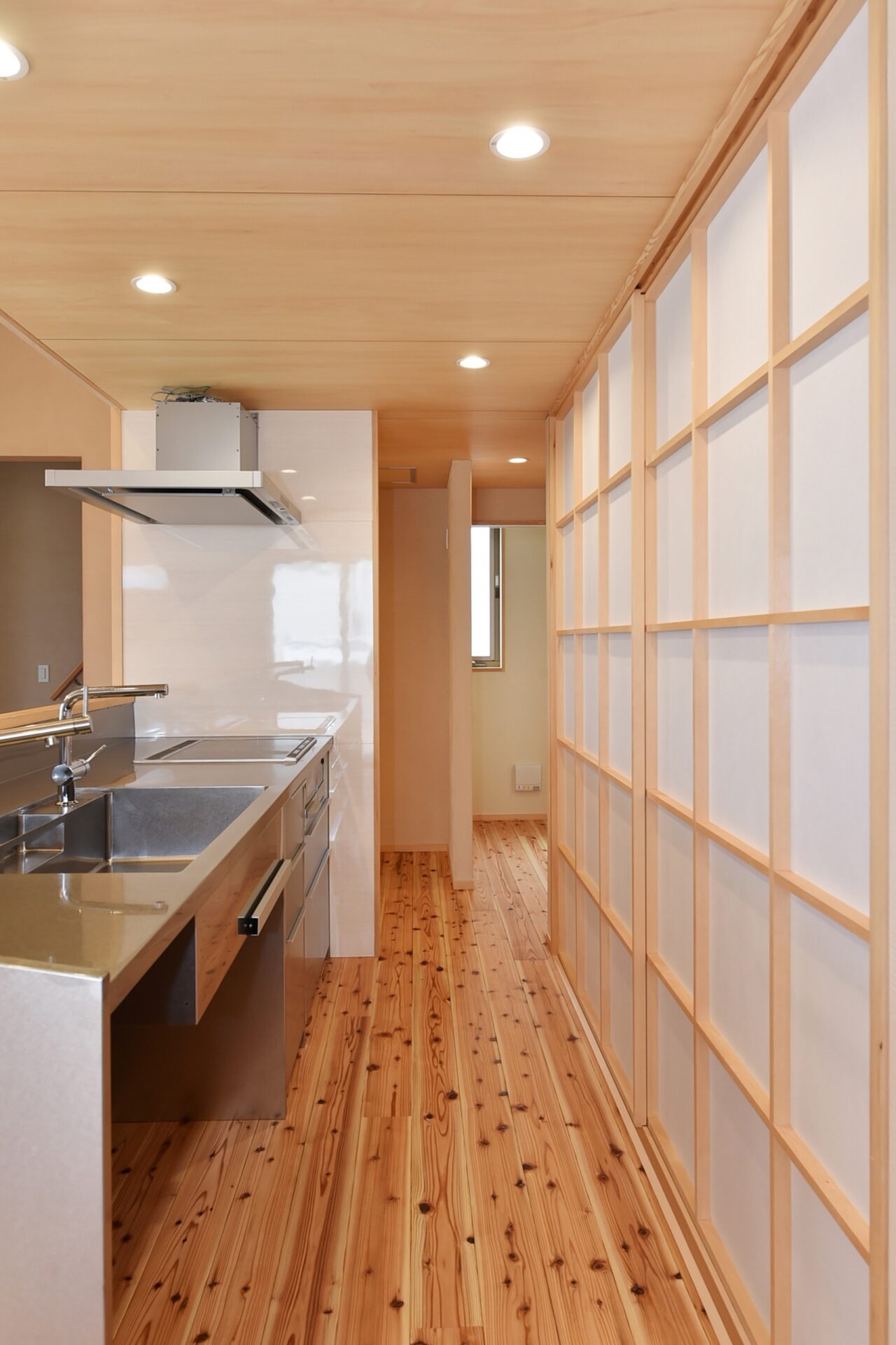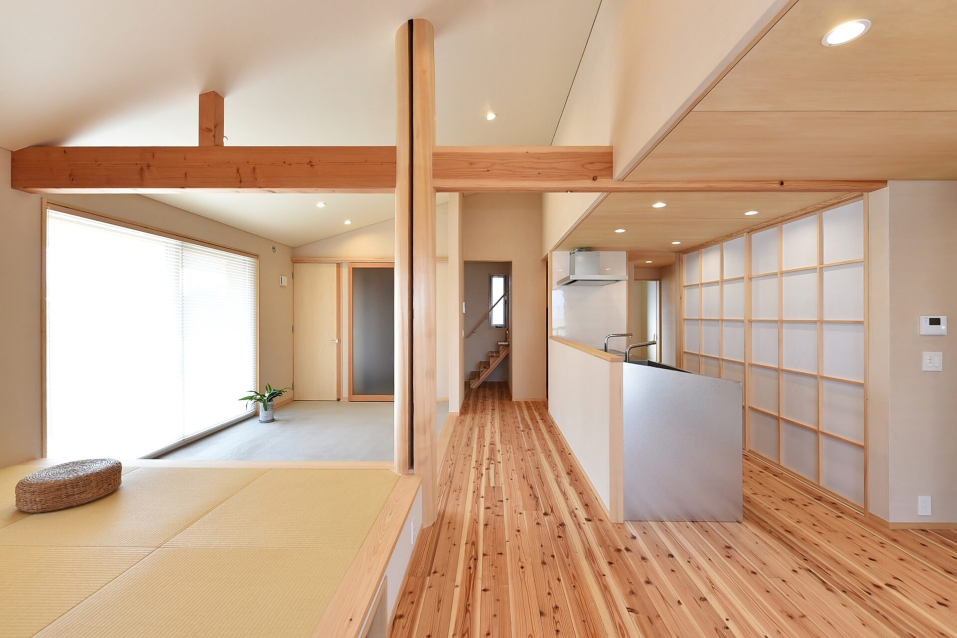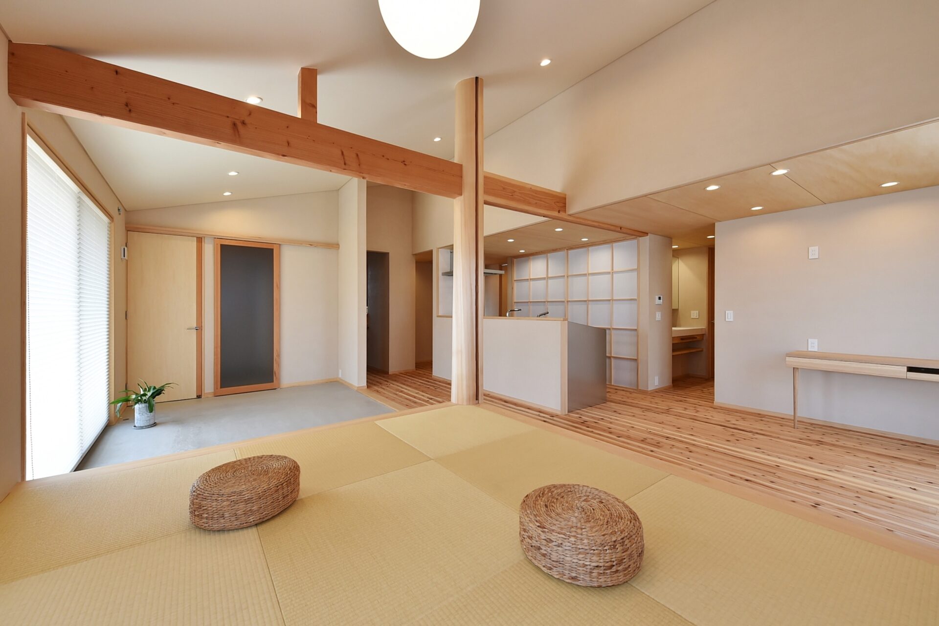 works 建築事例 HOME建築事例趣味を愉しむ土間のある家 趣味を愉しむ土間のある家 栃木県足利市 S様邸 平屋に見える二階建ての家。行き止まりのない回遊動線を設けることで、日々の暮らしやすさも考慮。 趣味を愉しむスペースとして活用できる広い土間を設けたり、小上がりの畳スペースを設けたり、家族それぞれの居場所を作っています。 こだわりのオーダーキッチンもや洗面台も室内全体を美しい空間に統一し、質感を高めています。 Tags #和モダン #土間 #平屋 #造作家具