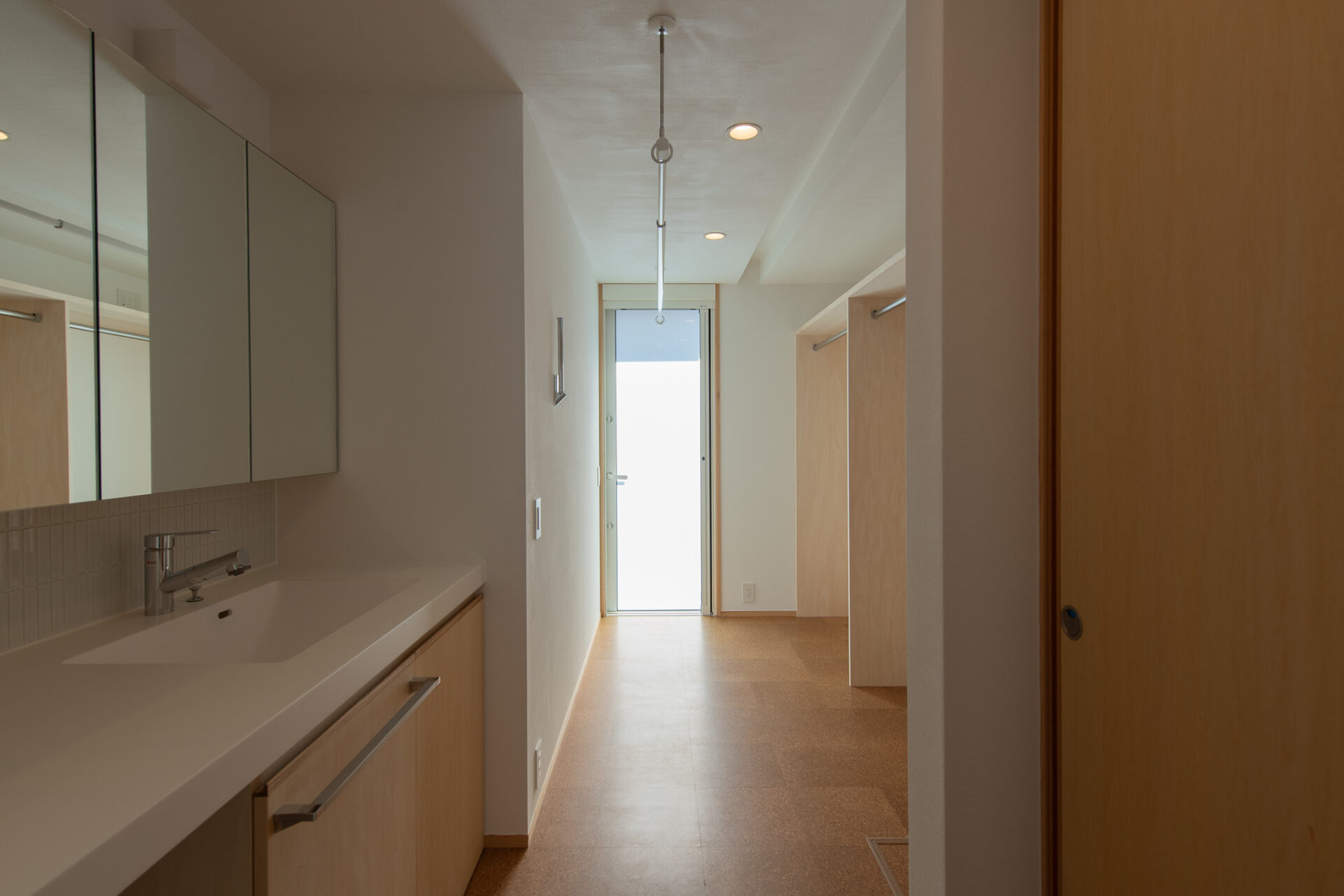 水廻りは一直線につないだ動線になっており、くつろぎの空間をすっきり保てるのも魅力です。