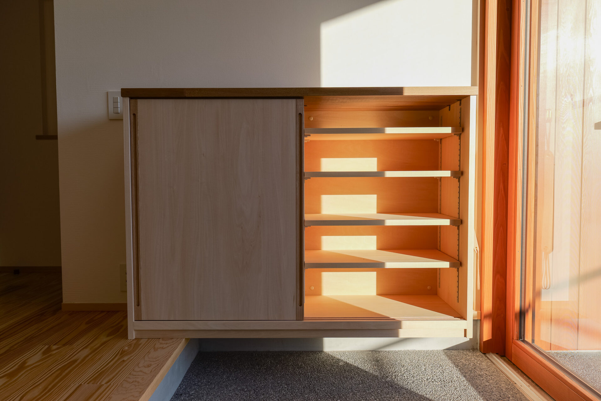 各所に設けた造作家具は、住まい手の暮らしに合わせて丁寧につくり込まれ、空間に一体感と心地よさをもたらしています。