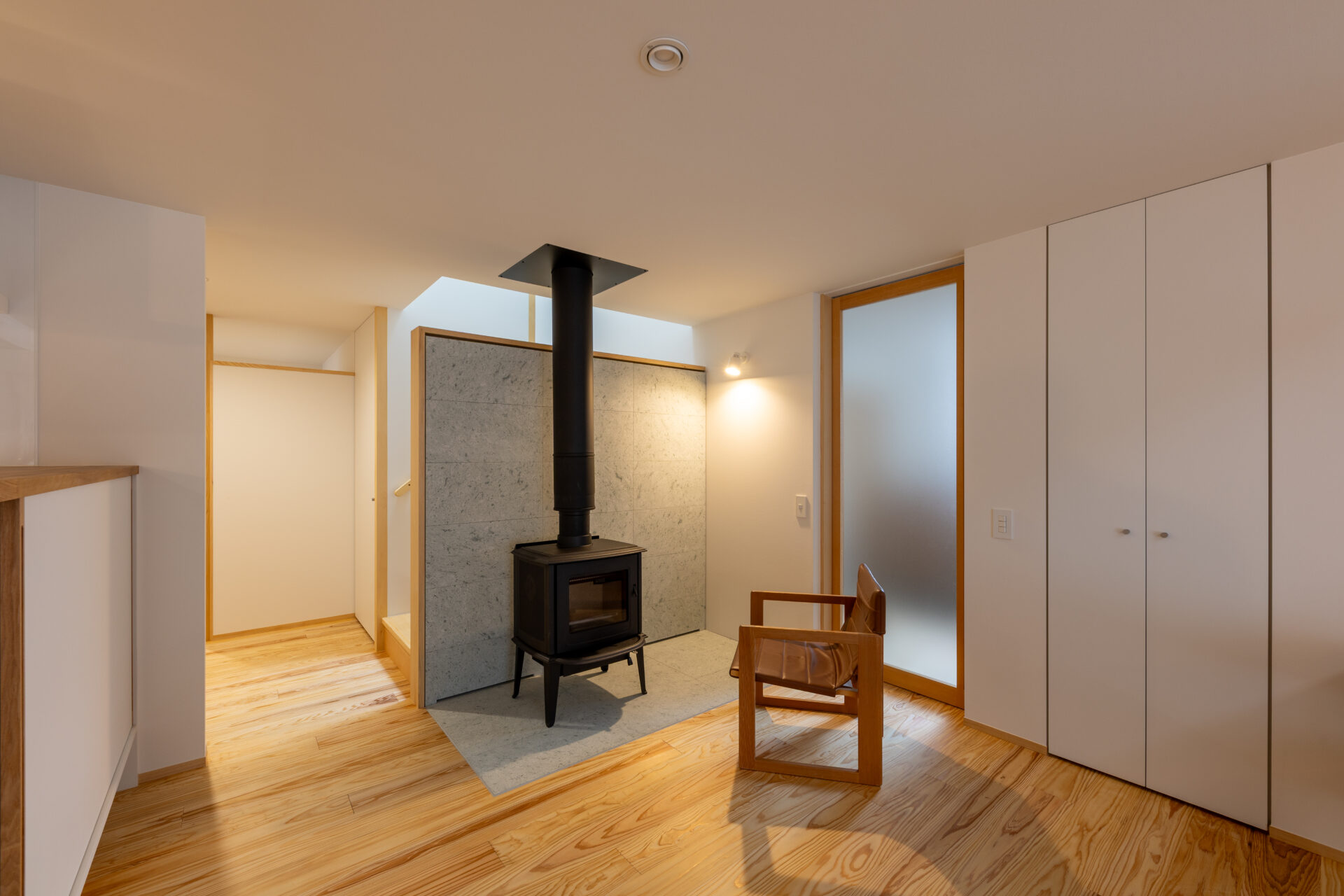 薪ストーブがリビングのアクセントとなり、和室は落ち着きのある佇まいに。