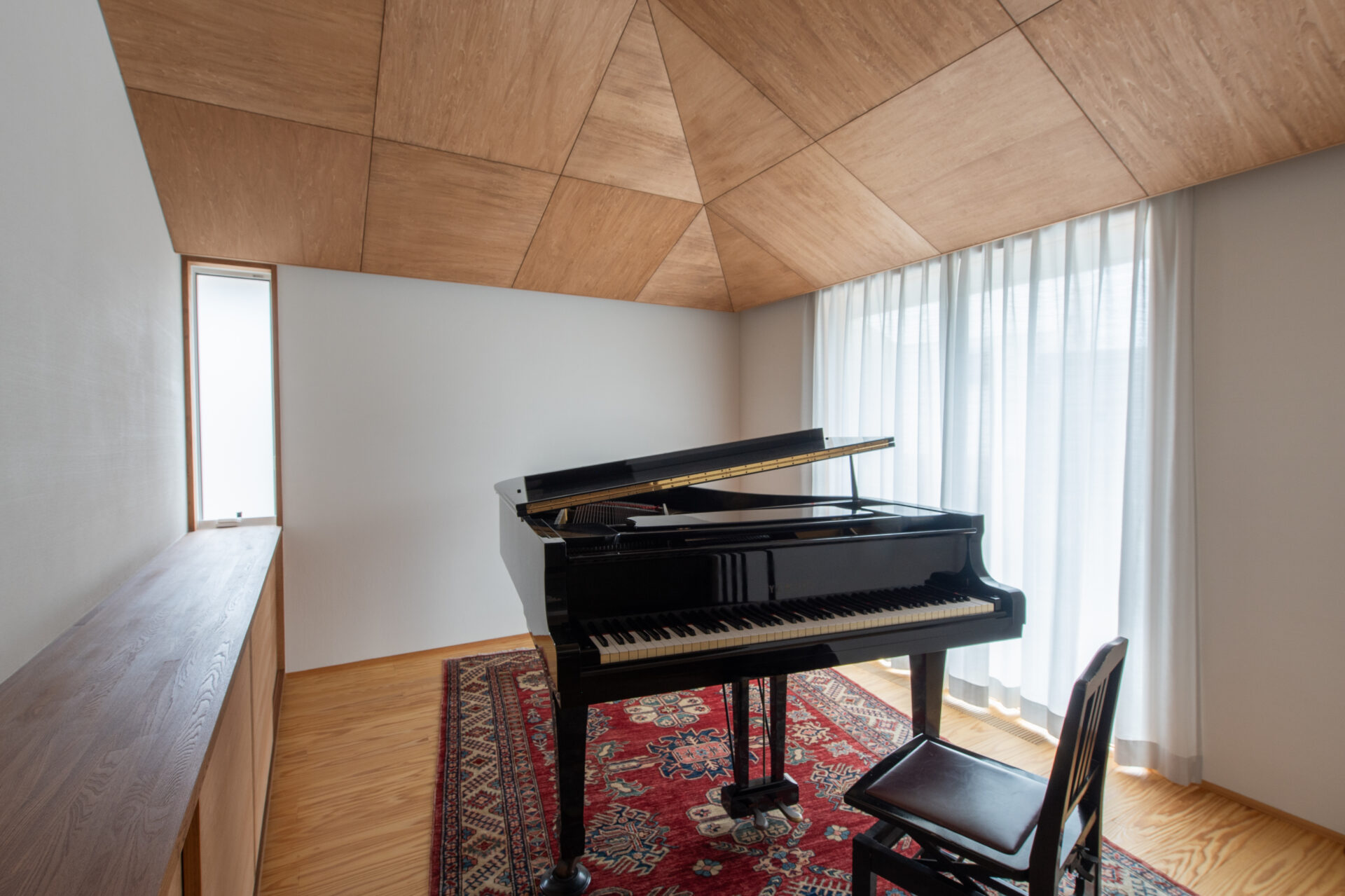 ホールを挟んで配置したピアノ室とリビングは、ともに勾配天井。明るく開放的なリビングと、重厚感のあるピアノ室の対比が、この住まいの大きな魅力です。