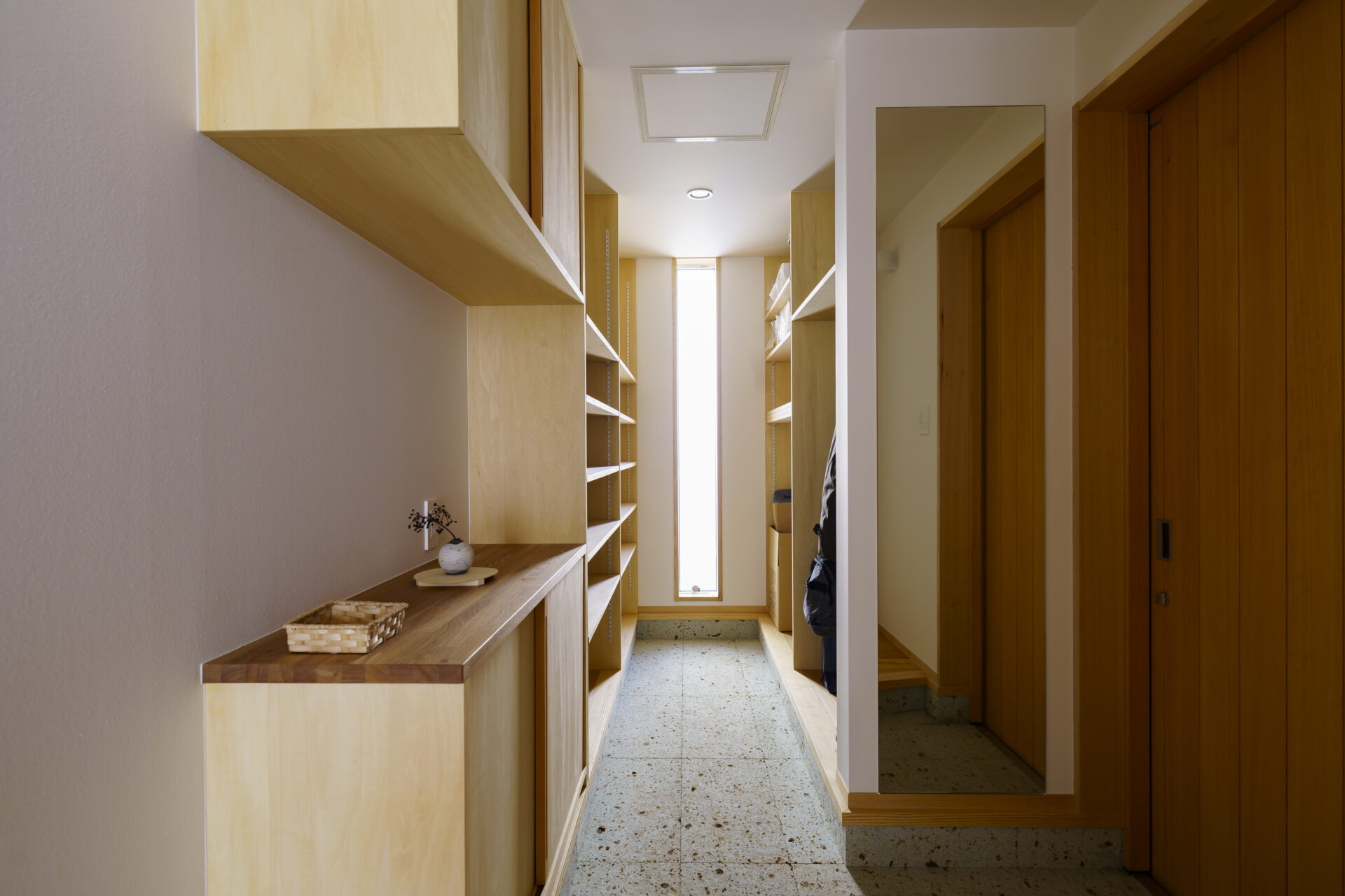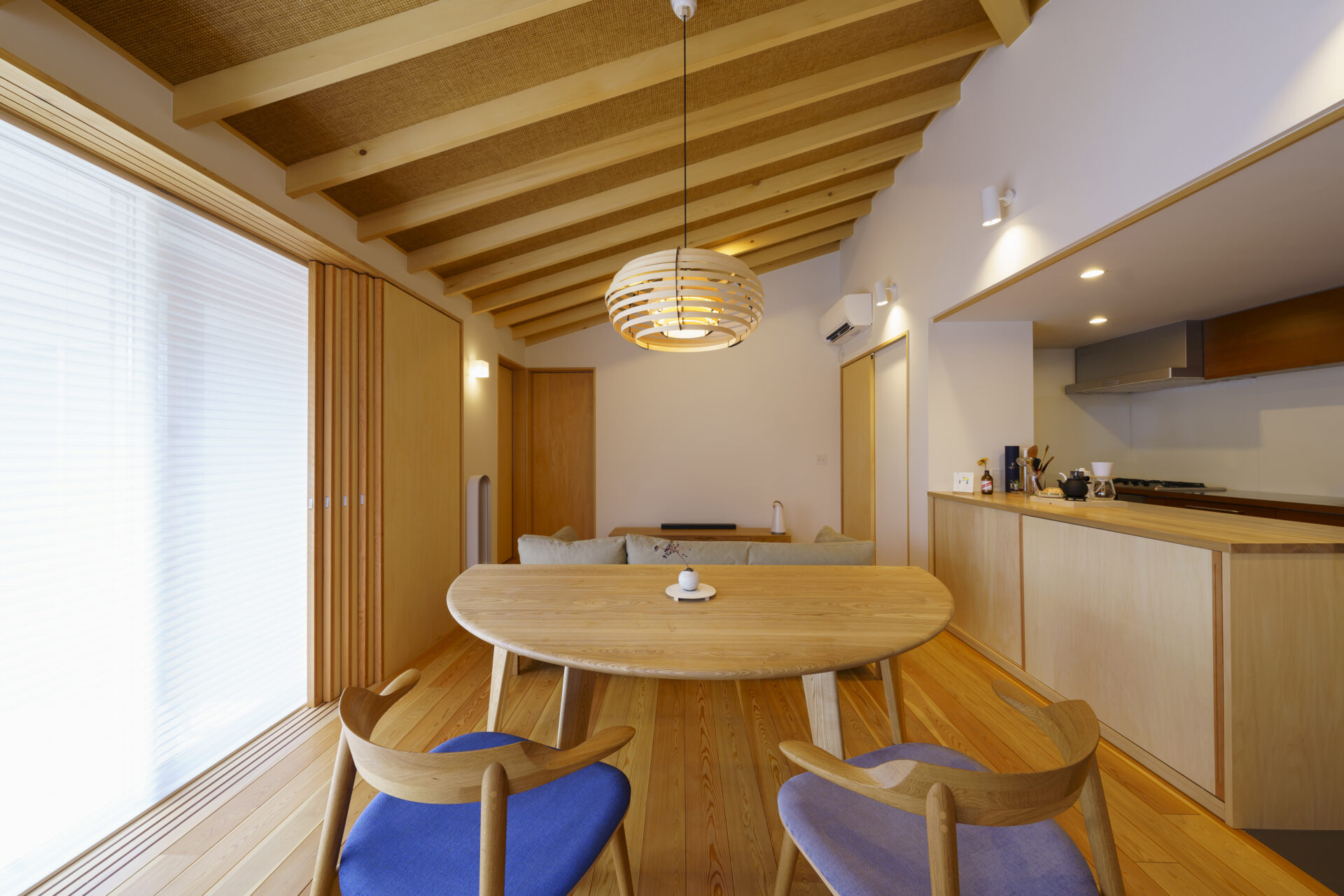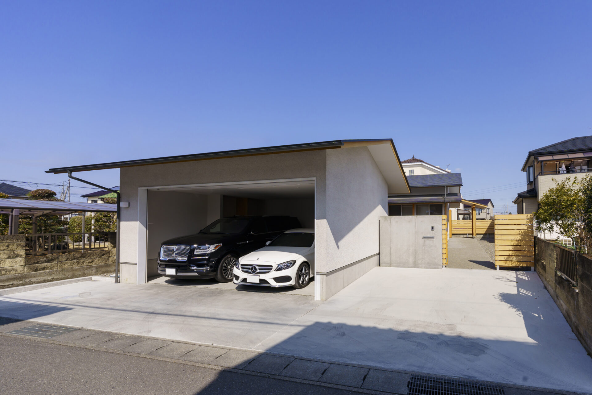 works 建築事例 HOME建築事例戸建てガレージのある平屋 戸建てガレージのある平屋 高崎市 K様 別棟で設けたガレージから、雨に濡れずに家へと繋がる動線を確保しました。 木塀で視線を遮り、落ち着いたプライベートを確保する工夫が。玄関には造作のシューズクロークを設け、収納力と使い勝手を両立しています。 リビングは勾配天井と化粧垂木で開放感あふれる空間に。オーナー様のこだわりを反映したオーダーキッチンも魅力のひとつです。 洗面・ランドリーには東南の光が差し込み、明るく心地よい空間に仕上がりました。 Tags #ガレージ #塗り壁 #平屋 #造作家具