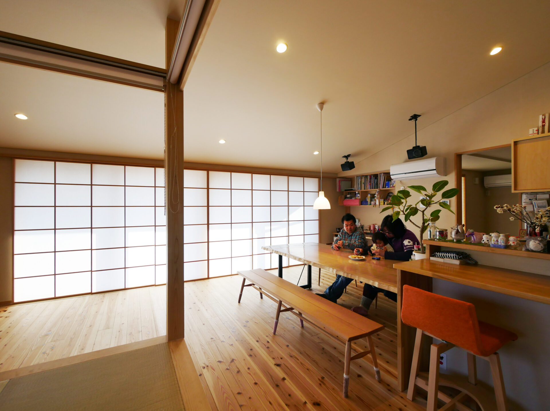 夏は風が心地よく抜け、冬は高性能サッシと内障子で暖かく。性能とデザインを両立した空間は、長く住み継ぐにふさわしい心地よさを備えています。