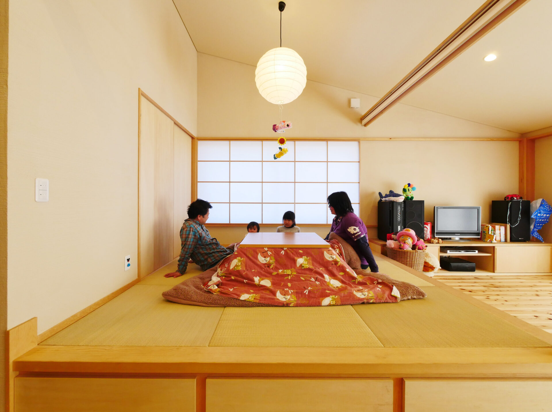勾配天井による開放感と、小上がりの和室が生み出す落ち着きが共存し、暮らしに多彩な表情をもたらします。